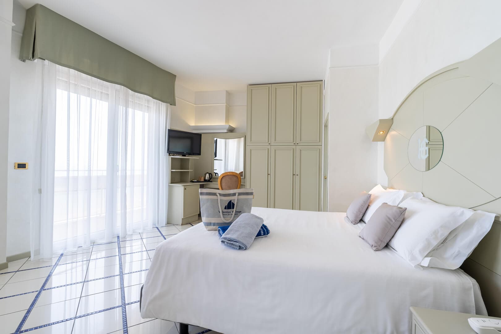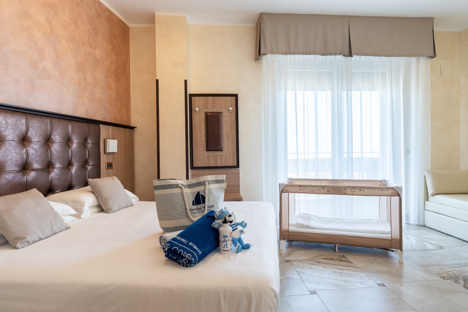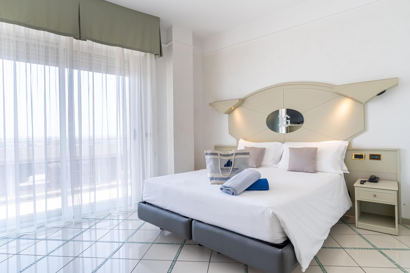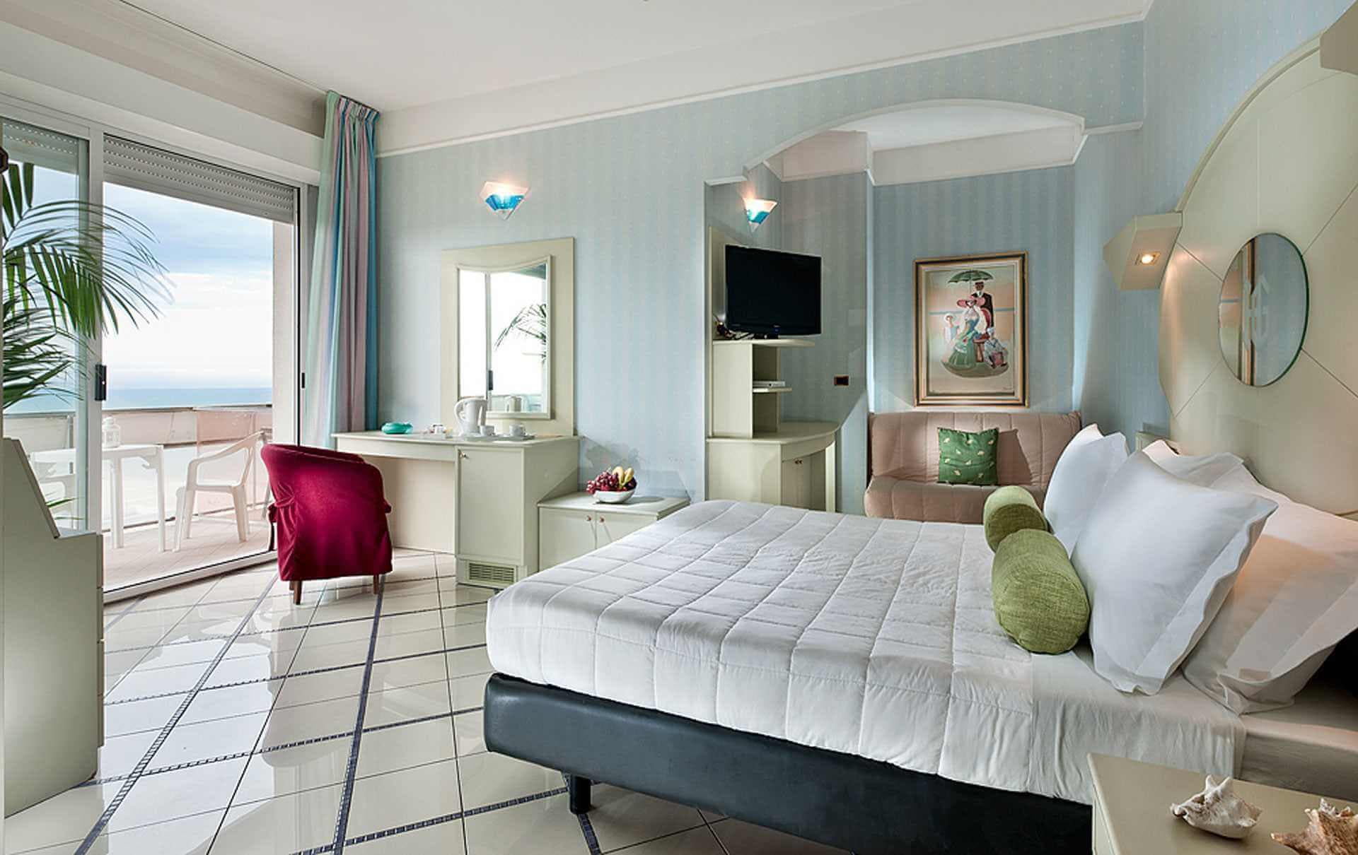 Die Superior Rooms befinden sich auf den obersten Etagen des Hotels und blicken aufs Meer hinaus. Der Balkon am Meer begleitet die schönsten Momente des Tages: das Aufwachen im Licht der Adria, eine ruhige Pause, während die Kinder sich ausruhen oder abends nach einem arbeitsreichen Tag nach Hause kommen.