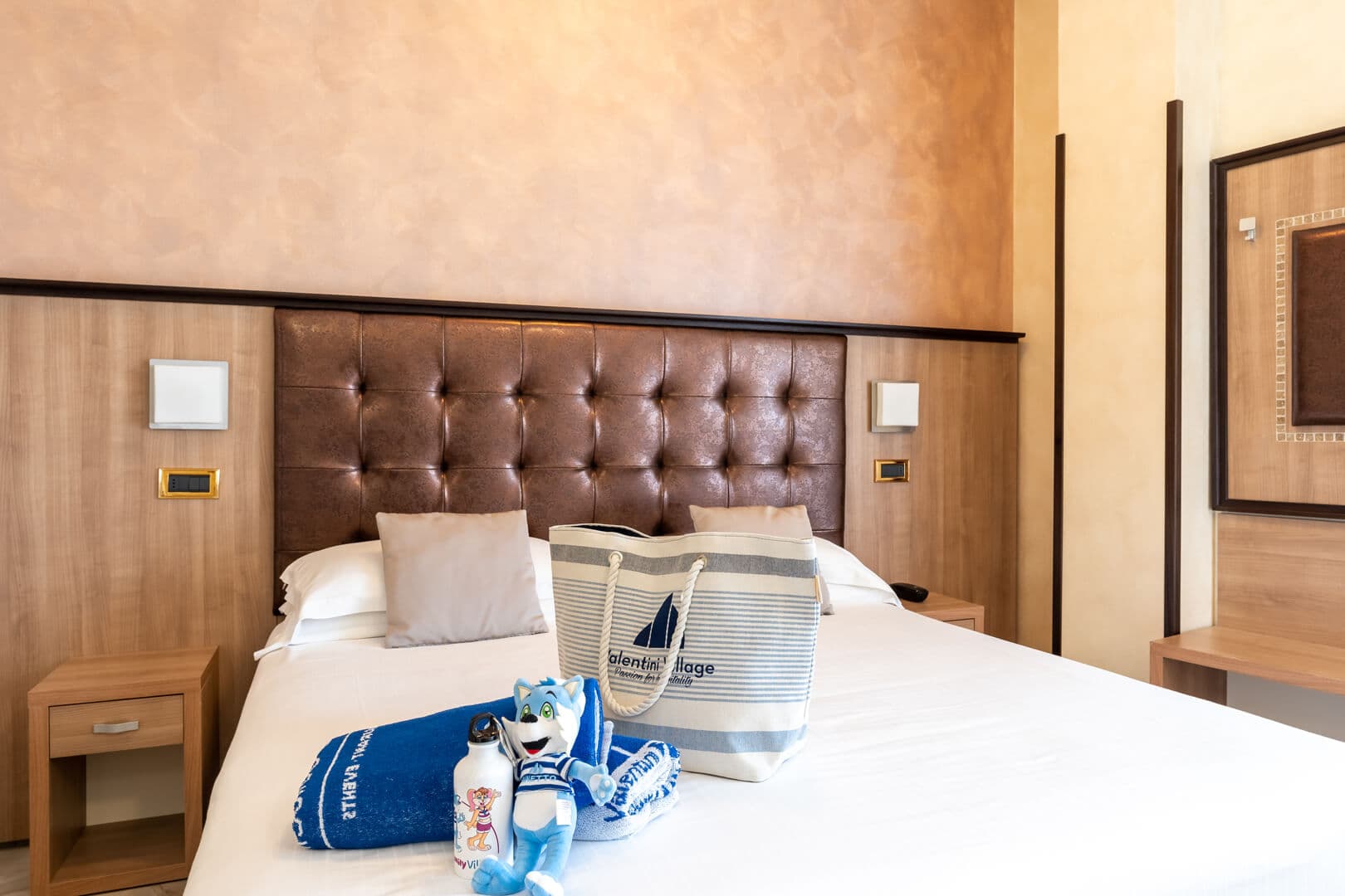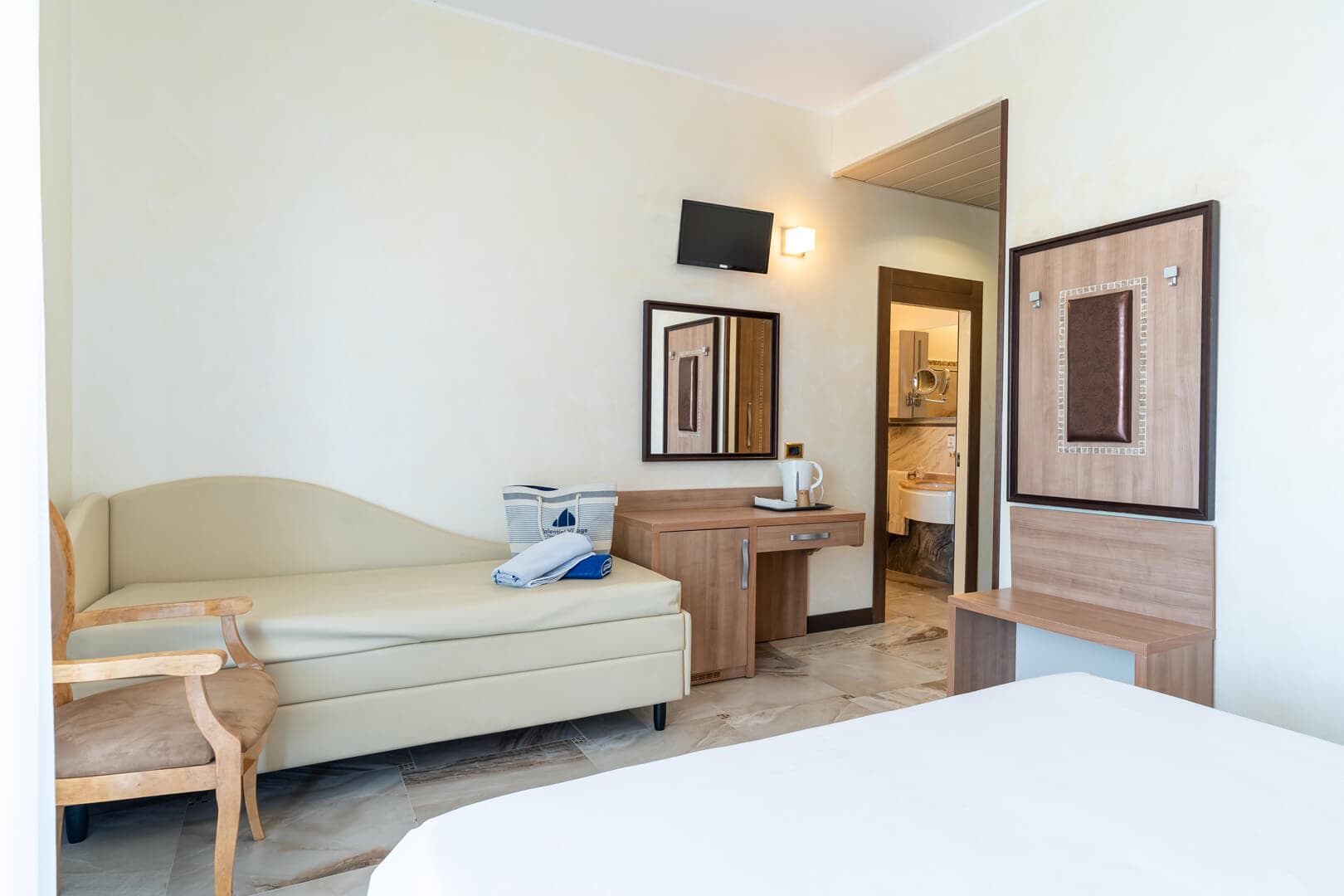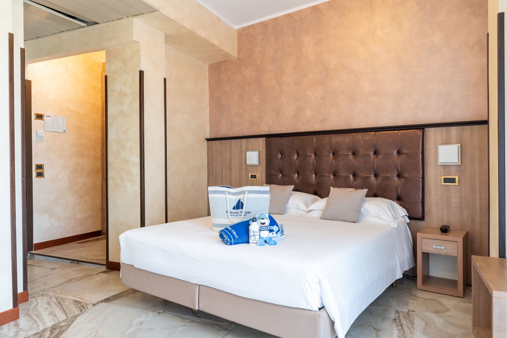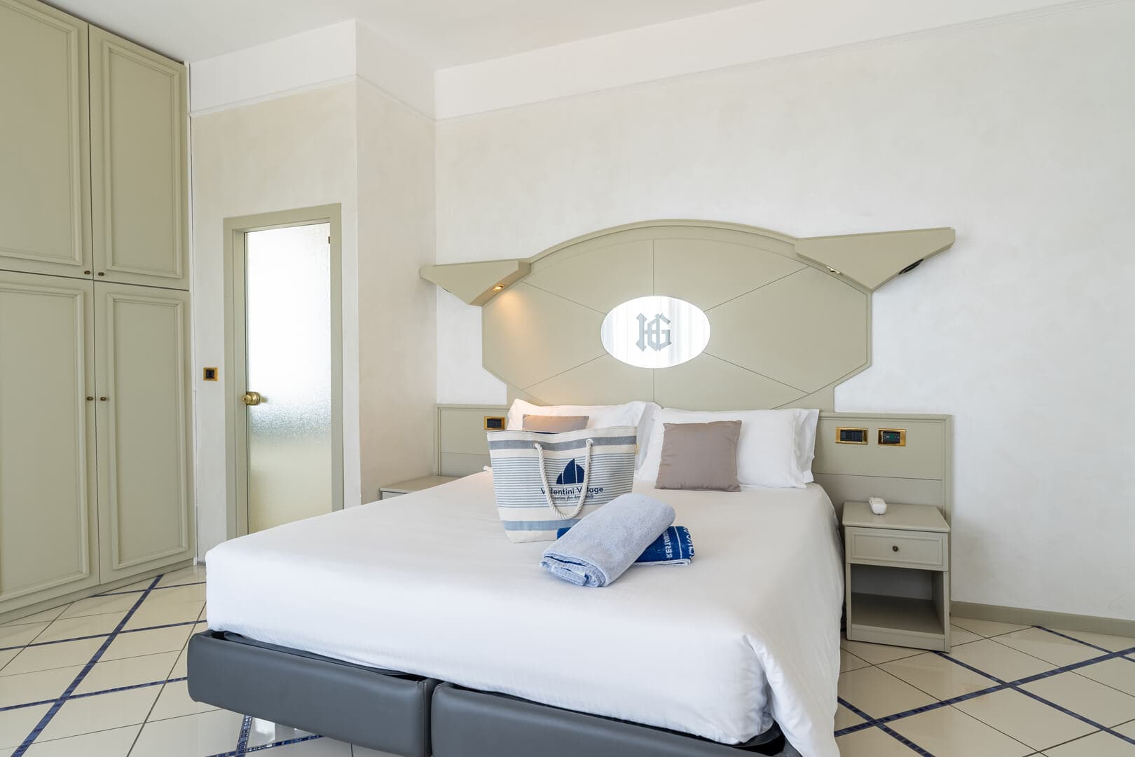 Die Superior Rooms befinden sich auf den obersten Etagen des Hotels und blicken aufs Meer hinaus. Der Balkon am Meer begleitet die schönsten Momente des Tages: das Aufwachen im Licht der Adria, eine ruhige Pause, während die Kinder sich ausruhen oder abends nach einem arbeitsreichen Tag nach Hause kommen.