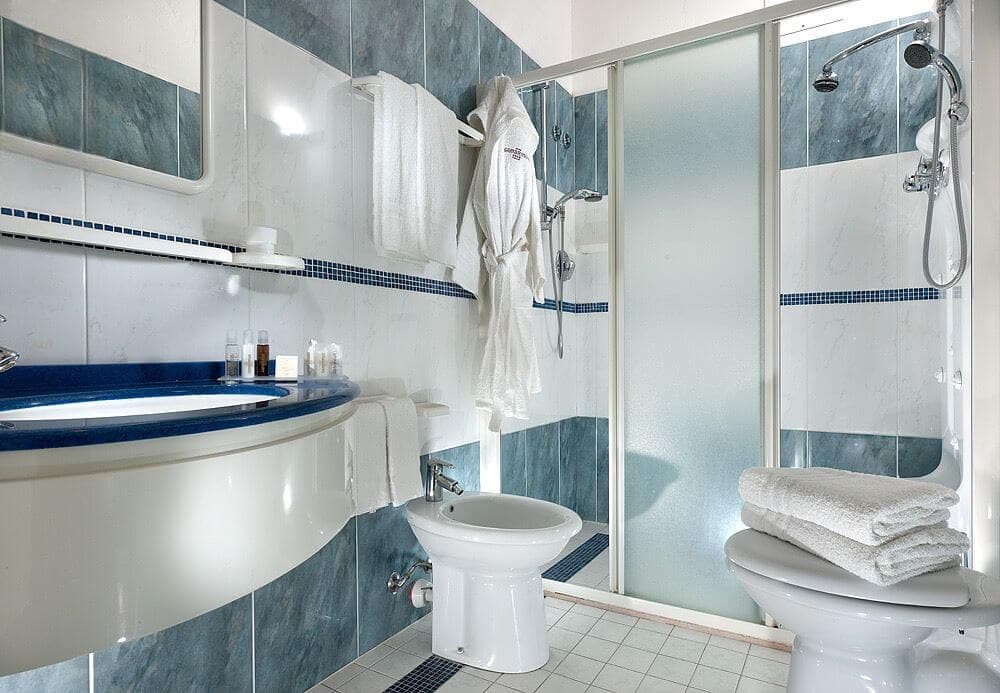 Das Badezimmer mit Hydromassage-Dusche oder Whirlpool-Badewanne auf Wunsch wird am Ende des Tages zu einem Moment der Entspannung. Bademantel und Hausschuhe vervollständigen das Erlebnis und vermitteln ein sofortiges Gefühl von Wohlbefinden. Ein Raum, der die Feiertage flüssiger macht und Platz für das Meer und das Familienleben lässt.