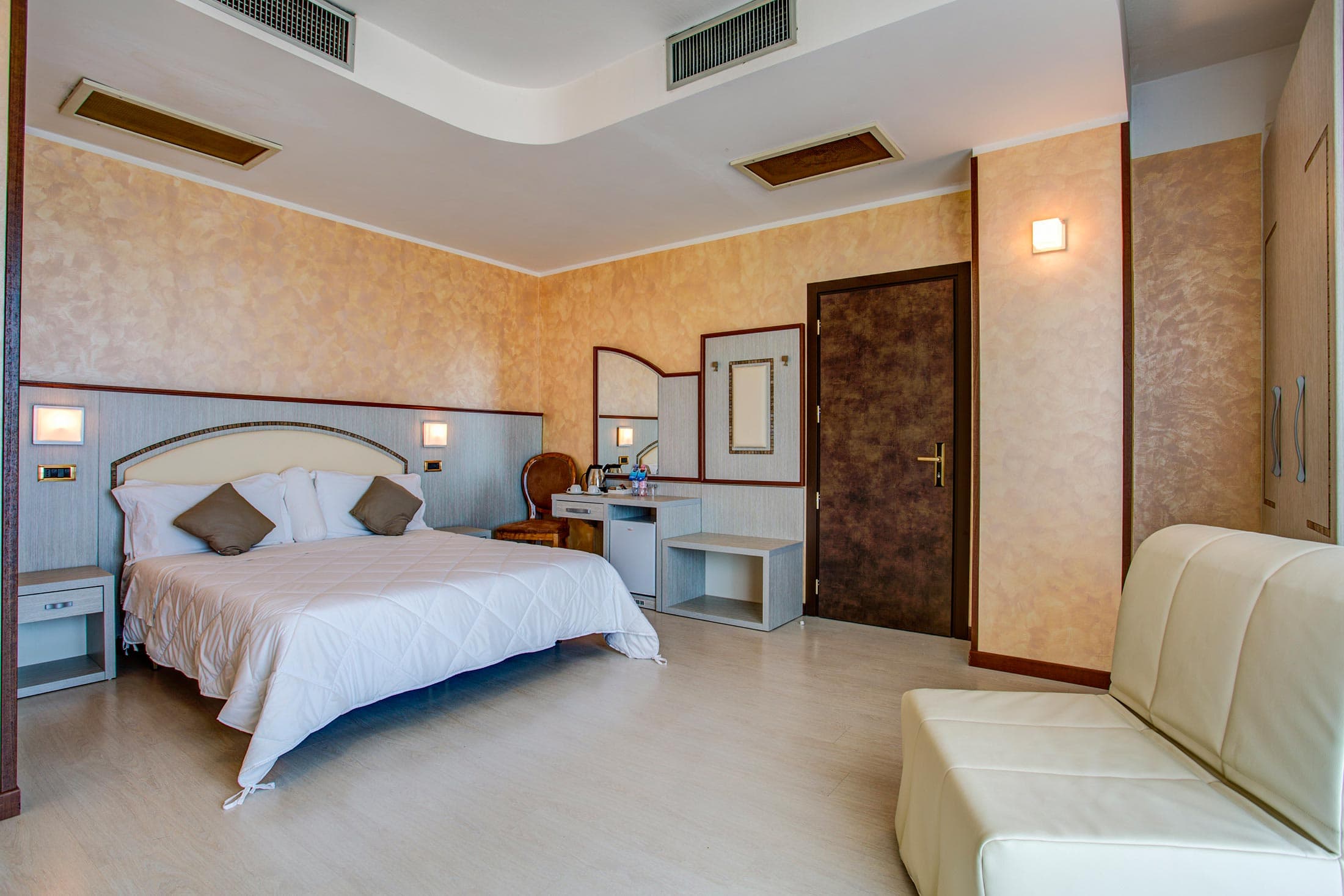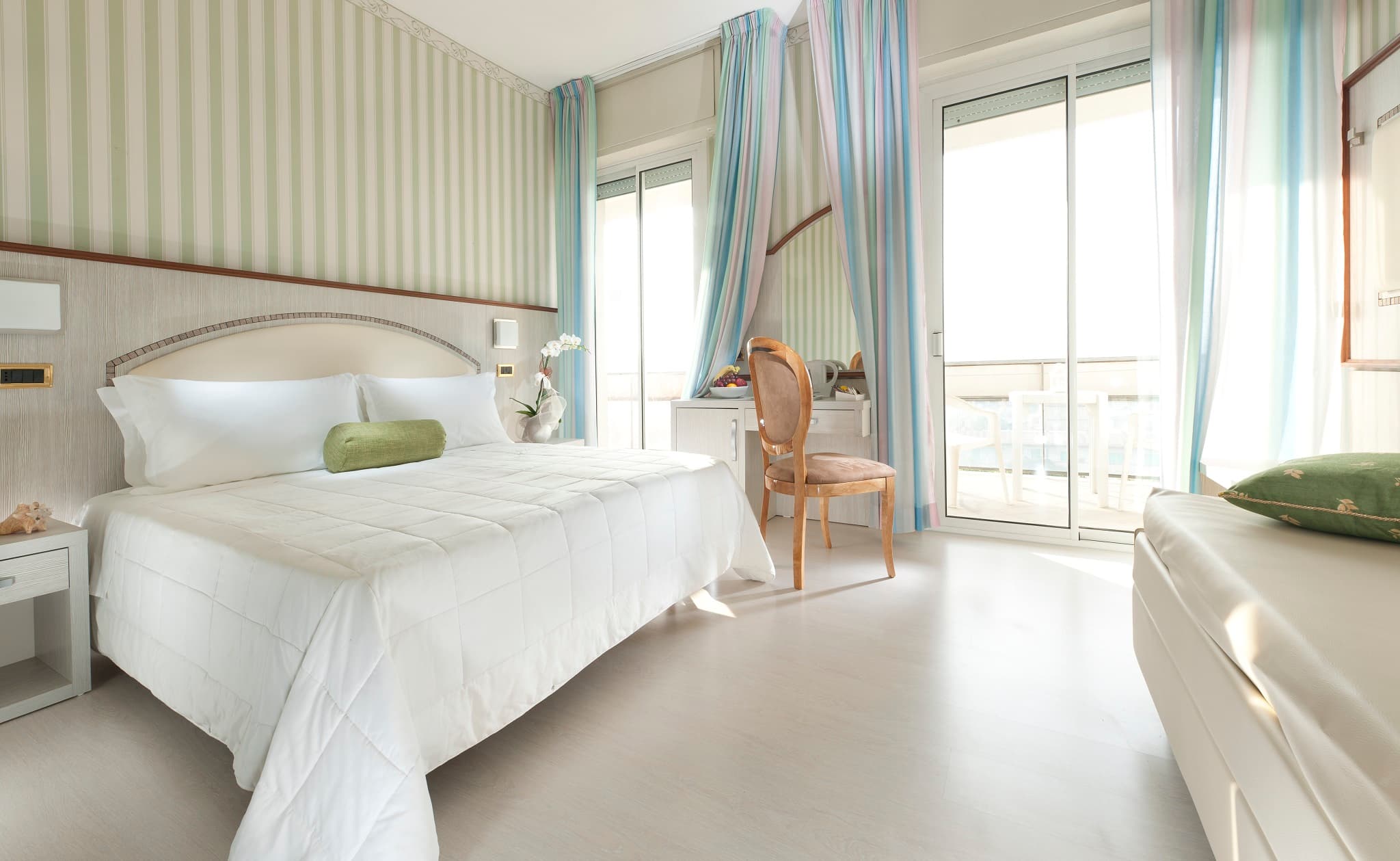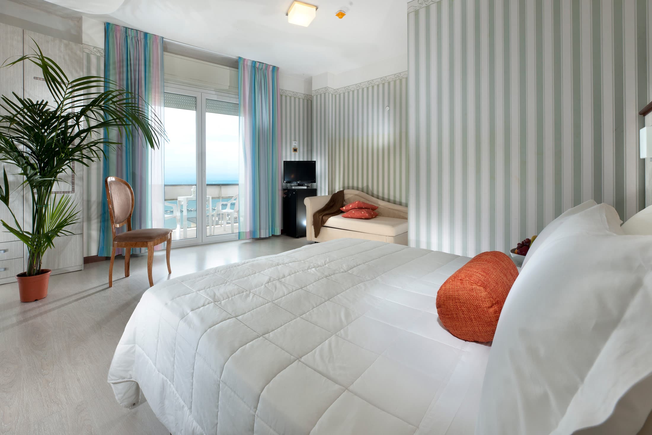 Situata al sesto piano, la Camera Comfort Fronte Mare è pensata per chi viaggia in gruppo o con una famiglia numerosa e ha bisogno di più spazio, senza rinunciare alla vista sul mare. L’ampio balcone diventa un vero prolungamento della stanza: un luogo dove fermarsi a guardare l’Adriatico, stendere i teli o prendersi una pausa mentre i bambini giocano o si rilassano.